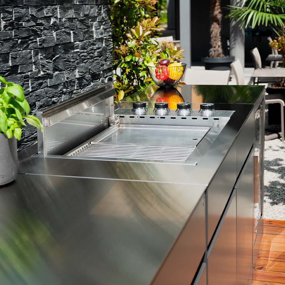 Mit unserem Gasgrill-Modul lassen sich vielseitige und leckere Gerichte unter freiem Himmel zaubern! Beim eingebauten Gasgrill aus Edelstahl handelt es sich um ein Qualitätsprodukt der Marke Indu+. Der Gasgrill ist mit vier Brenner und einer Fettauffangschale ausgestattet. Die zweizonige Grillfläche umfasst einen klassischen Grillrost und eine Teppanyaki-Platte, auf deren allerlei Zutaten (zum Beispiel: Fleisch, Fisch, Gemüse oder Eier) zubereitet werden können. Beide Grillflächen sind herausnehmbar und erleichtern somit die Reinigung des Grills.
